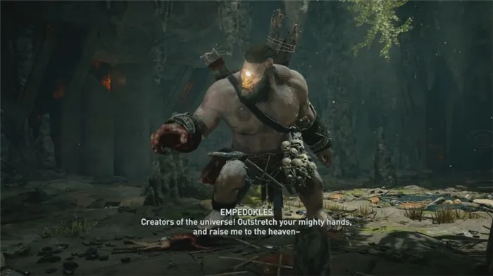 Спасите Эмпедокла, когда он попросит одежду, отдайте ее ему, а Эмпедоклу помогите найти ключ. Возьми ключ, Эмпедокл. Начните миссию «Лестница на Олимп» (остров Тисби, Фокис). Эмпедокл откроет портал к Циклопу. Совет: Направьте свой лук ему в глаз, затем попадите в него и так далее, несколько раз. Примерно на полпути к увеличению HP он выбьет кусок из стены, здесь тактика уже не сработает, он прикроет глаз рукой, здесь лучше бить его сзади. Если он не любит огонь, заранее выгравируйте на оружии надпись «Урон от огня». После того как вы убьете его, он бросит артефакт Первой цивилизации.