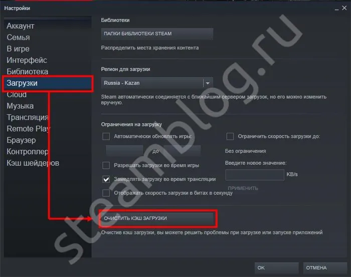 - Внизу есть кнопка «Очистить кэш загрузки».