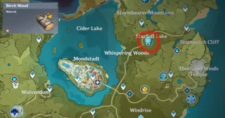 Березы распространены по всему Тейвату, но одно из самых легких мест, где их можно найти, — озеро Старфелл.