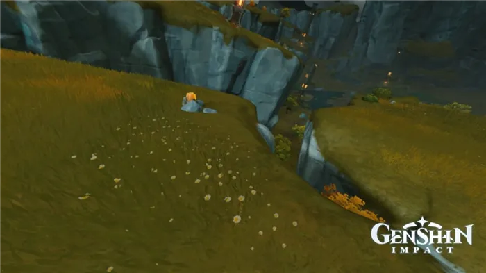 Телепортируйтесь на вершину этой горы, а затем продолжите путь к подножию, собирая по пути материалы. В основном это делается вдоль скал.