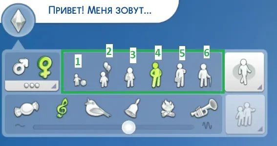 - Откроется редактор персонажей. Здесь вы можете установить возраст в левом верхнем углу. Вы можете выбрать один из шести возрастов симулятора, включая младенческий. Выбрав возраст, вы можете увидеть, как будет выглядеть симуляция. После редактирования не забудьте нажать на галочку в правом нижнем углу.