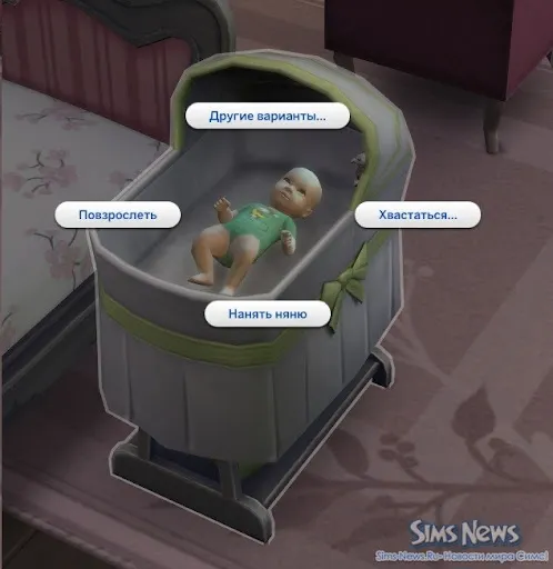 В The Sims 4 дети появляются в семье двумя способами. Влюбленные симы либо создают щенка с помощью кровати, либо усыновляют его с помощью компьютера за тысячу единиц виртуальной валюты. После любого из вышеперечисленных действий ребенок появляется в ранее купленной колыбели (если в игре ее нет, создается колыбель по умолчанию). Чтобы малыш быстрее встал на ножки, нужно нажать на нужного ребенка, выбрать вкладку «другие параметры» и нажать на «расти».