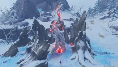 Следуйте в область, выделенную на рисунке ниже. Там есть большой кусок льда. В показанной области есть несколько красных кварцев, они также отмечены на изображении. Собирайте их один за другим и разбивайте лед, скрывающий дерево. Когда блок будет завершен, вы увидите дерево и замерзшие обломки, которые необходимо активировать.