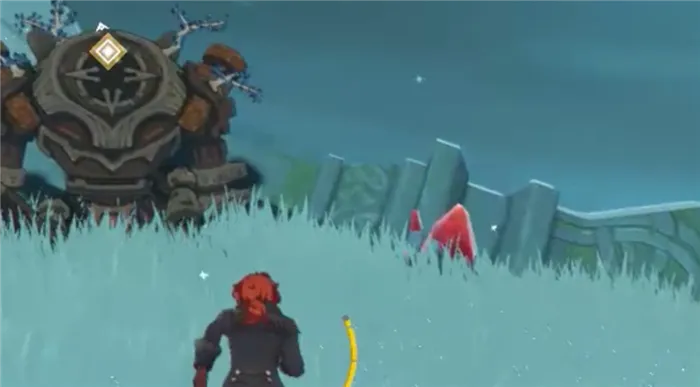 - Первый фрагмент. Находится недалеко от Руинного охотника, где обнаружили месторождение первого алого кварца. Подходить не обязательно. Можно использовать лучника (зарядите стрелу алым кварцем). Ледяной фрагмент на этой локации достаточно растопить один раз. После разрушения фрагмента появится сфера. Взаимодействуйте с ней для разблокировки печатей.