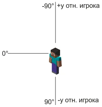 Угол к горизонтальной плоскости измеряется по оси север-юг. Направление взгляда игрока составляет 0° на юг, 180° на север и -180° на север. По мере продвижения с юга на запад угол увеличивается от 0° до 180°, что является положительным числом. По мере продвижения на восток угол уменьшается от 0° до -180°, что является отрицательным числом.