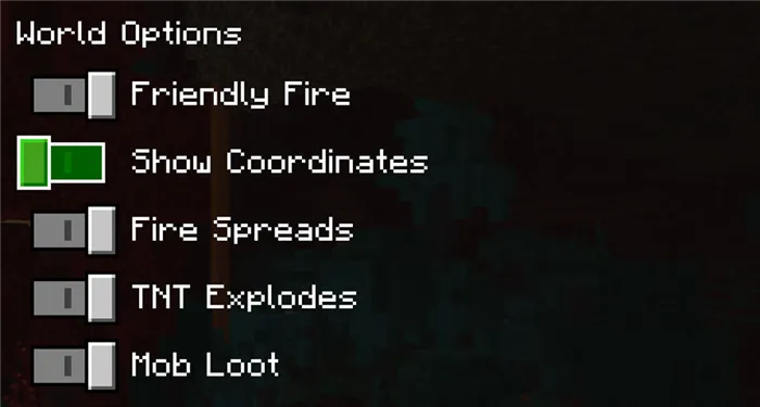 Bedrock — это универсальная версия Minecraft для множества различных платформ. В эту версию можно играть на Windows 10, PS4, Xbox, Pocket Edition (PE) и NintendoSwitch. Поэтому, если вы играете в какую-либо из них, этот раздел для вас. Чтобы отображать координаты в Bedrock или Windows 10, необходимо включить их при создании игры. В разделе Параметры мира найдите и щелкните опцию Показать координаты. По умолчанию он выключен, и его необходимо включать каждый раз, когда вы начинаете новую игру.