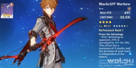 Базовая атака также увеличивается с 44 до 565, что делает Blackcliff Battlebow перспективным луком для Эмбера. Доступ к нему можно получить на бирже Starglitter Exchange.