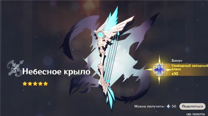 Крылья неба» — это лук с 5 звездами и 48 базовыми единицами урона. Он увеличивает урон от критических ударов на 20-40% и наносит на 125% больше физического урона в небольшом радиусе. Результаты достигаются со скоростью 60-100% каждые 4-2 секунды.
