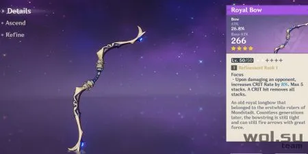 Королевский лук получить немного проще, чем обычный, так как его можно купить в магазине Паймона. Базовая сила атаки Королевского лука равна 42, с увеличением силы атаки на 9%.