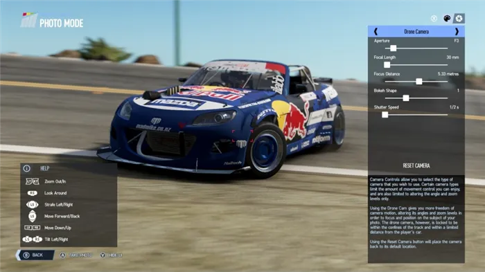Нажмите Start или Esc, чтобы вызвать меню, в котором можно выбрать режим Фото. Вы можете на время оставить машину в разгар гонки, вооружиться мощной камерой, расправить крылья и замедлить время. О таком настоящие фотографы могут только мечтать.
