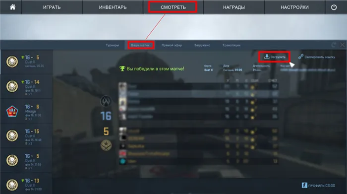 Если вы играете в обычную игру CS, вы можете загрузить полную демоверсию игры, если перейдете в раздел Matchmaking. Для этого перейдите в раздел «Ваши игры» и найдите в списке недавний матч. Нажмите кнопку «Загрузить», и через несколько мгновений демо-версия будет загружена на ваш компьютер.