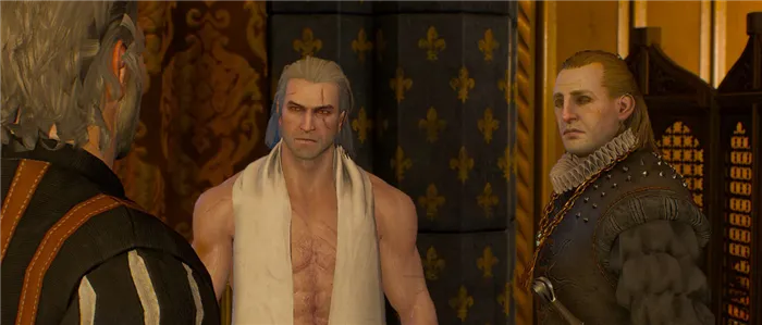 Итак, квест для зрителей начинается с того, что Геральт оказывается в огромной ванне в окружении прекрасных дам, которые наряжают его перед встречей с императором Эмгыром. Затем ведьму приглашают сесть на стул (бергер) и постричься.