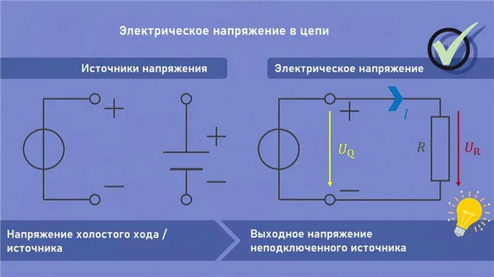 Также часто можно услышать термин «напряжение без нагрузки» или «напряжение источника». Это выходное напряжение ненагруженного источника, т.е. источника, к которому ничего не подключено. Если цепь замкнута на нагрузку, можно измерить только напряжение между полюсами источника.