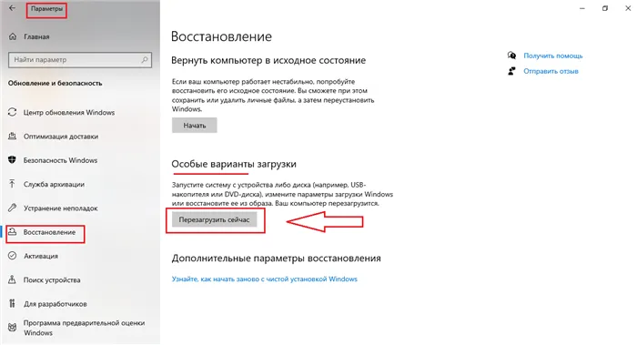 - нажать одновременно на строчку «Перезагрузить» и кнопку «Shift»;