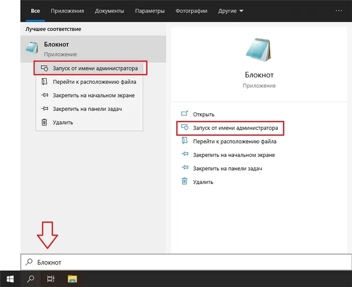 Откройте поисковую строку и введите «Блокнот». Выберите «Запуск от имени администратора».