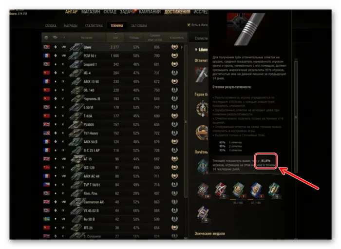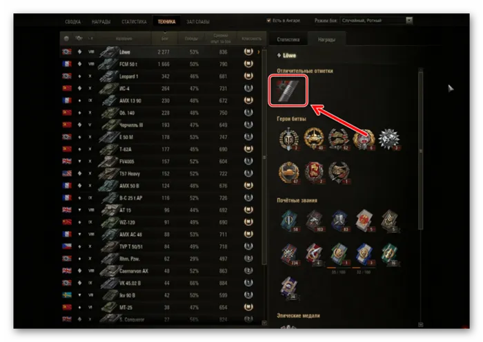 Нажмите на вкладку, чтобы увидеть список всех танков, в которые играет пользователь. Чтобы найти статистику по конкретному танку, нужно щелкнуть по нему. С правой стороны находится подзаголовок «Награды».