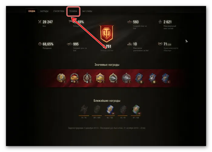 - Появляется окно с цифрами процента побед, достижениями и прочим. В верхней части окна есть вкладки по статистике. Вам необходимо нажать на Техника .